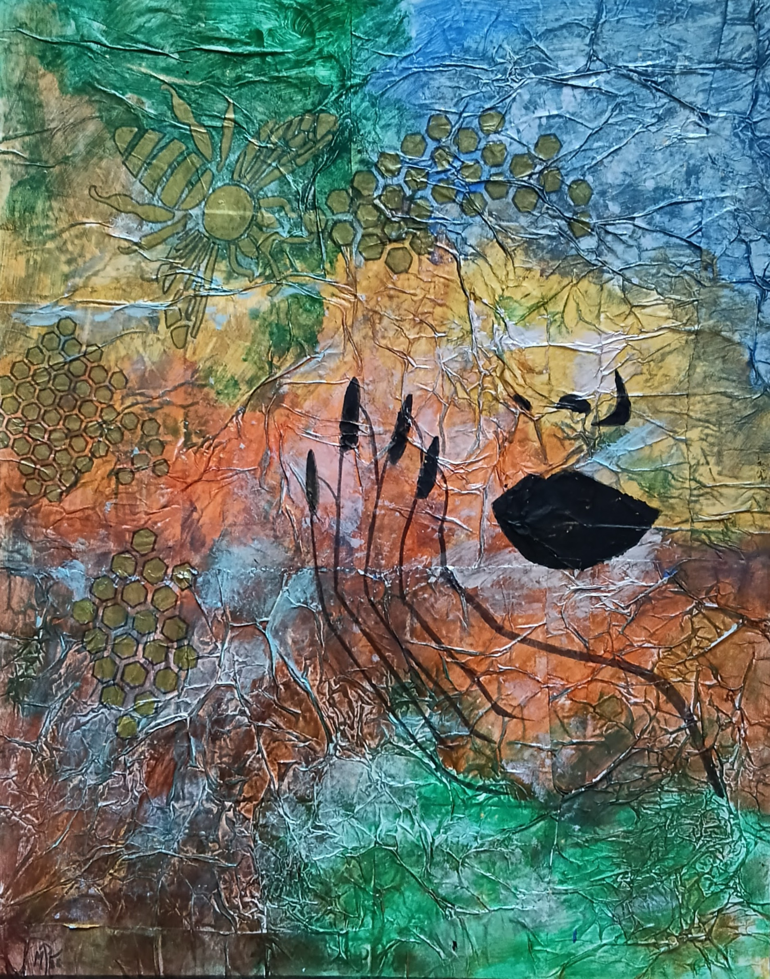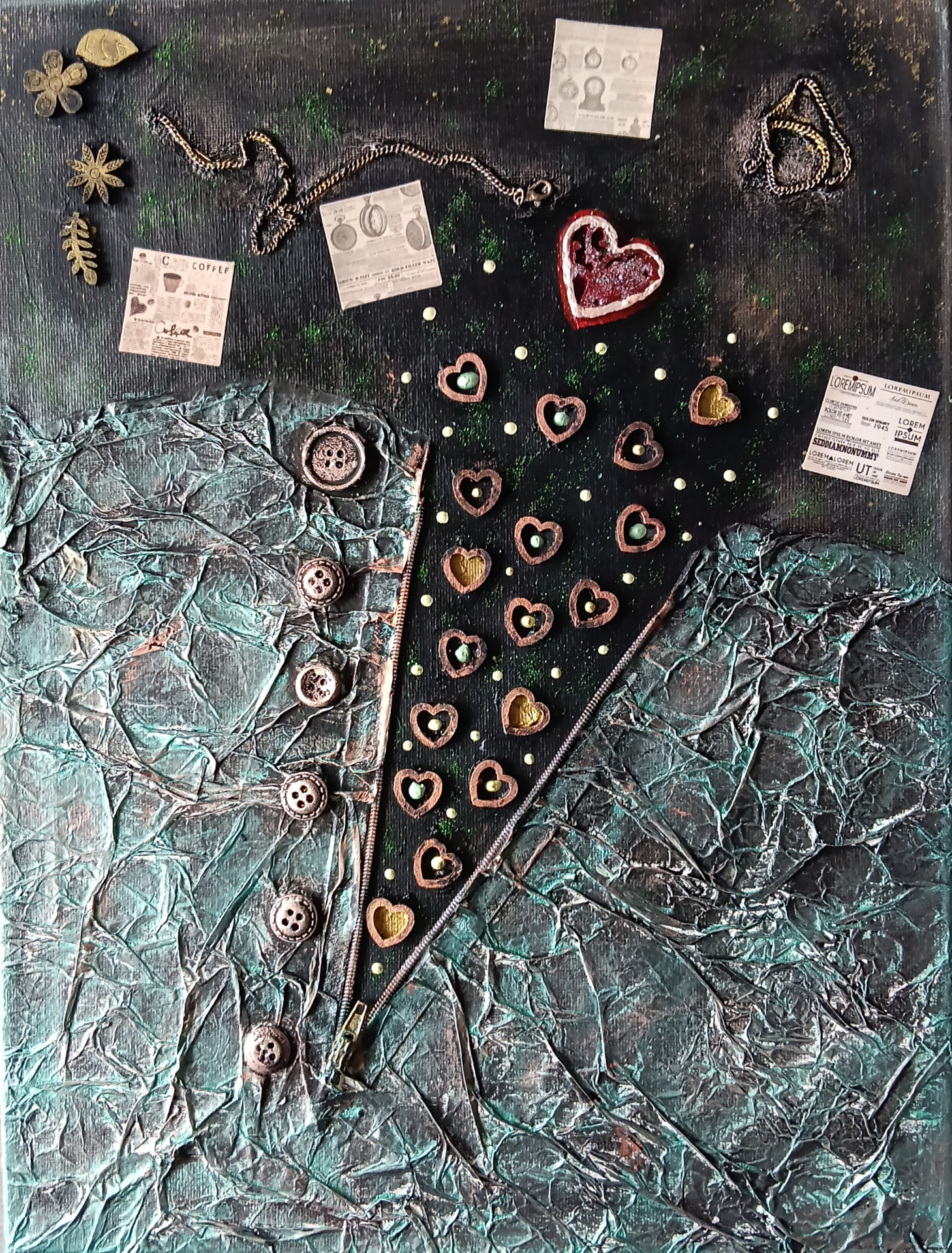 Kombinovaná technika ( suchý pastel, akryl, tvarovaci pasta, látka) lak, 50x60cm