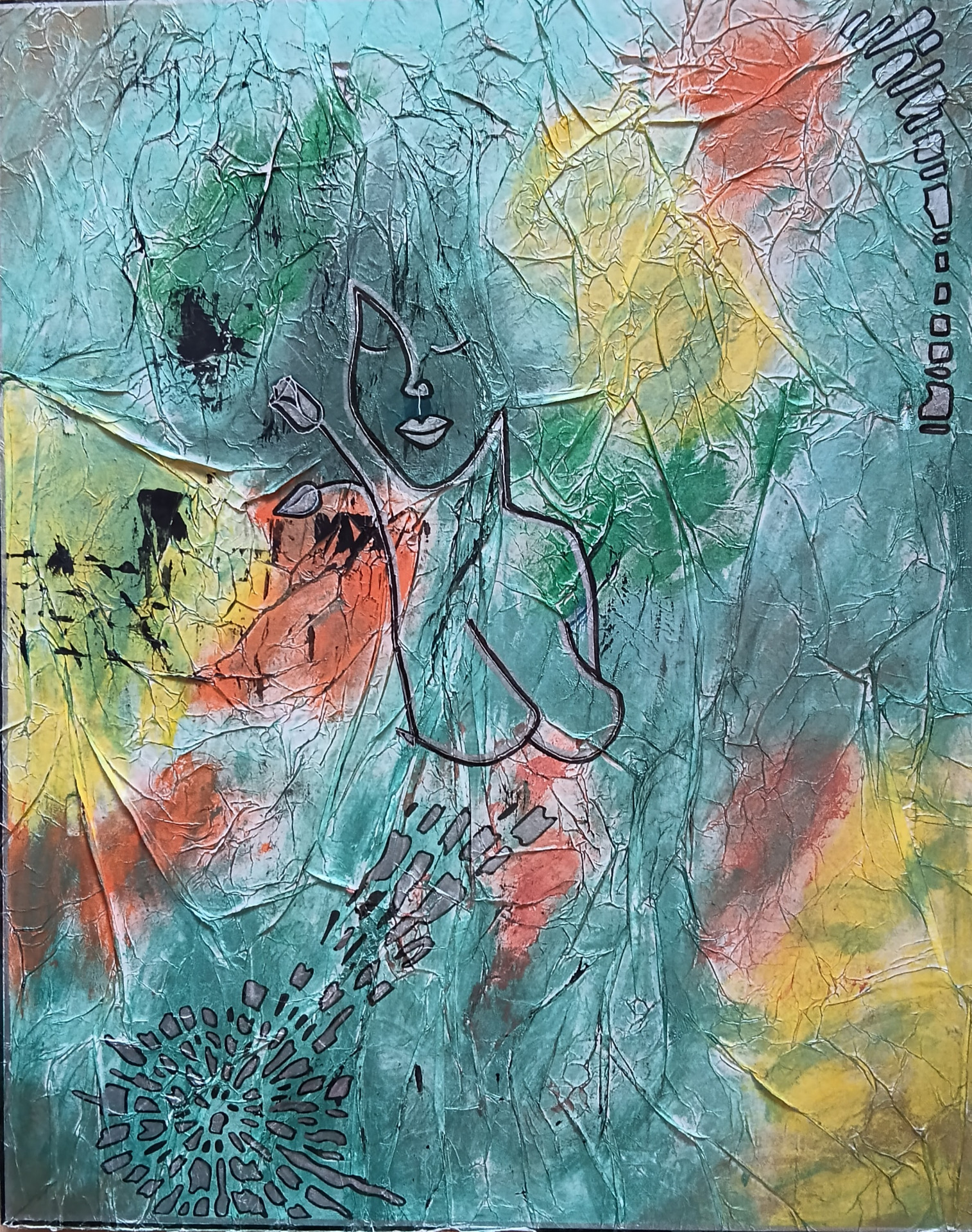 Akryl na plátně, zmačkaný papír, pasta. Lak. 50x50cm