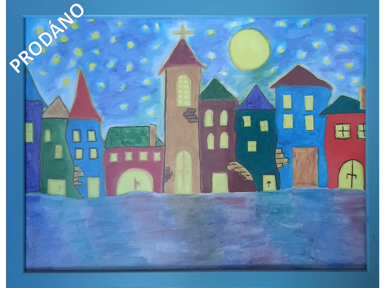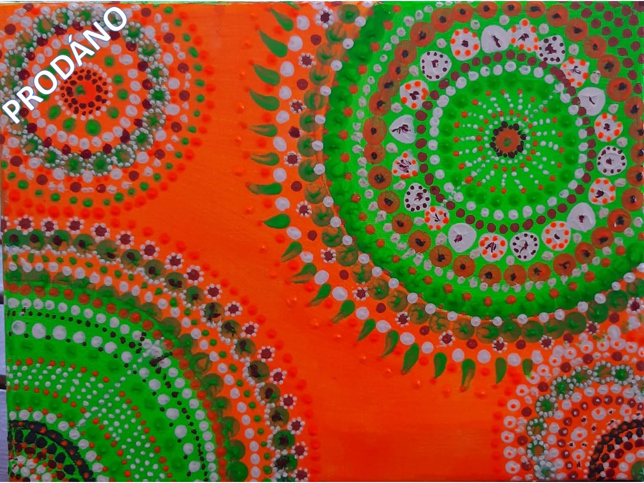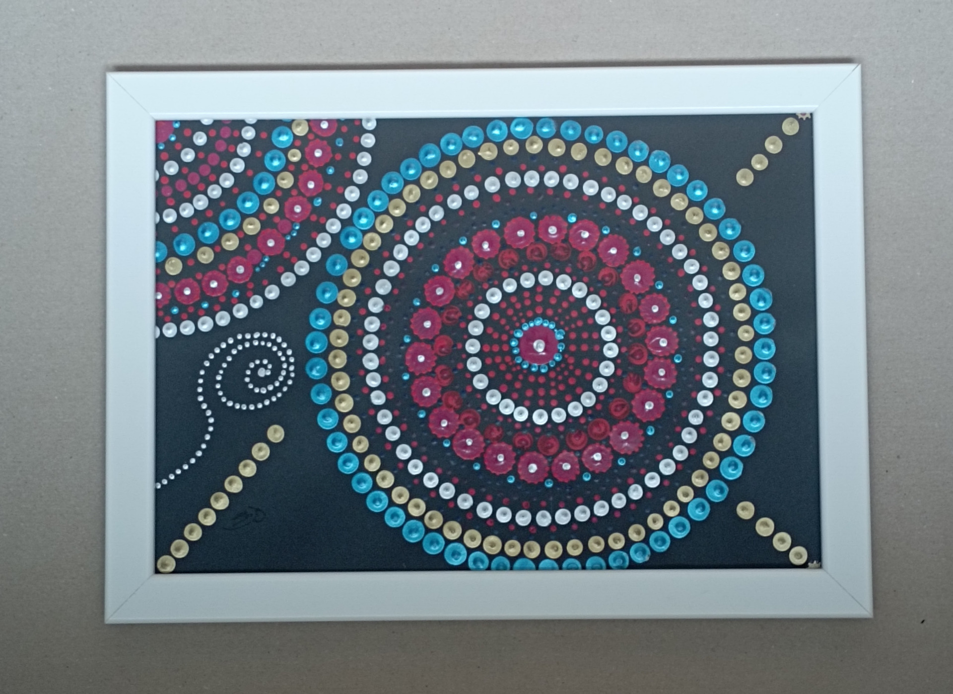 Technika tečkování, akrylové barvy, papír, bílý rámeček, možno pověsit nebo postavit, na šířku i na délku, 35x25cm